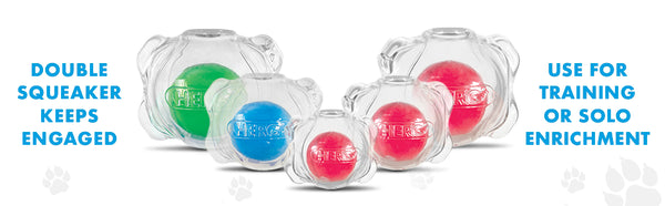 Hero Squeakables Amazing Bone Ball is a canine favorite! This ball has built-in chewing and handling nubs, making it easier for dogs to use. It is great for throwing, tossing, and chewing. Rolls and bounces erratically. Add treats for extra exploring fun!